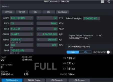 הזנת הנתונים ל-FMC נעשית דרך ה-MCDU. בדגם המטוס הזה ה-FMC אינו מבצע חישובי ביצועי המראה (בדומה ל-787 שלנו) והצוות מזין את הנתונים שהוא מחשב על OPT. לפיכך אין גם בדיקת נאותות של נתונים המוזנים, כל עוד הם בטווח המותר להזנה (100-300 קשר). כך נראו חישובי ההמראה על OPT: