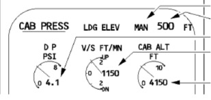 גובה הקבינה (הסקלה הימנית) האנלוגי מופיע בצבע ירוק, כל עוד הקבינה בטווח הנורמלי. כאשר גובה הקבינה עובר 9,550 רגל, התצוגה משנה צבע לאדום. לעומתה, התצוגה הדיגיטלית מתחילה להבהב, כאשר גובה הקבינה עובר 8,800 רגל. הודעת EXCESS CAB ALT מתקבלת על ה-ECAM כאשר הקבינה חוצה גובה 9,550 רגל כלפי מעלה.